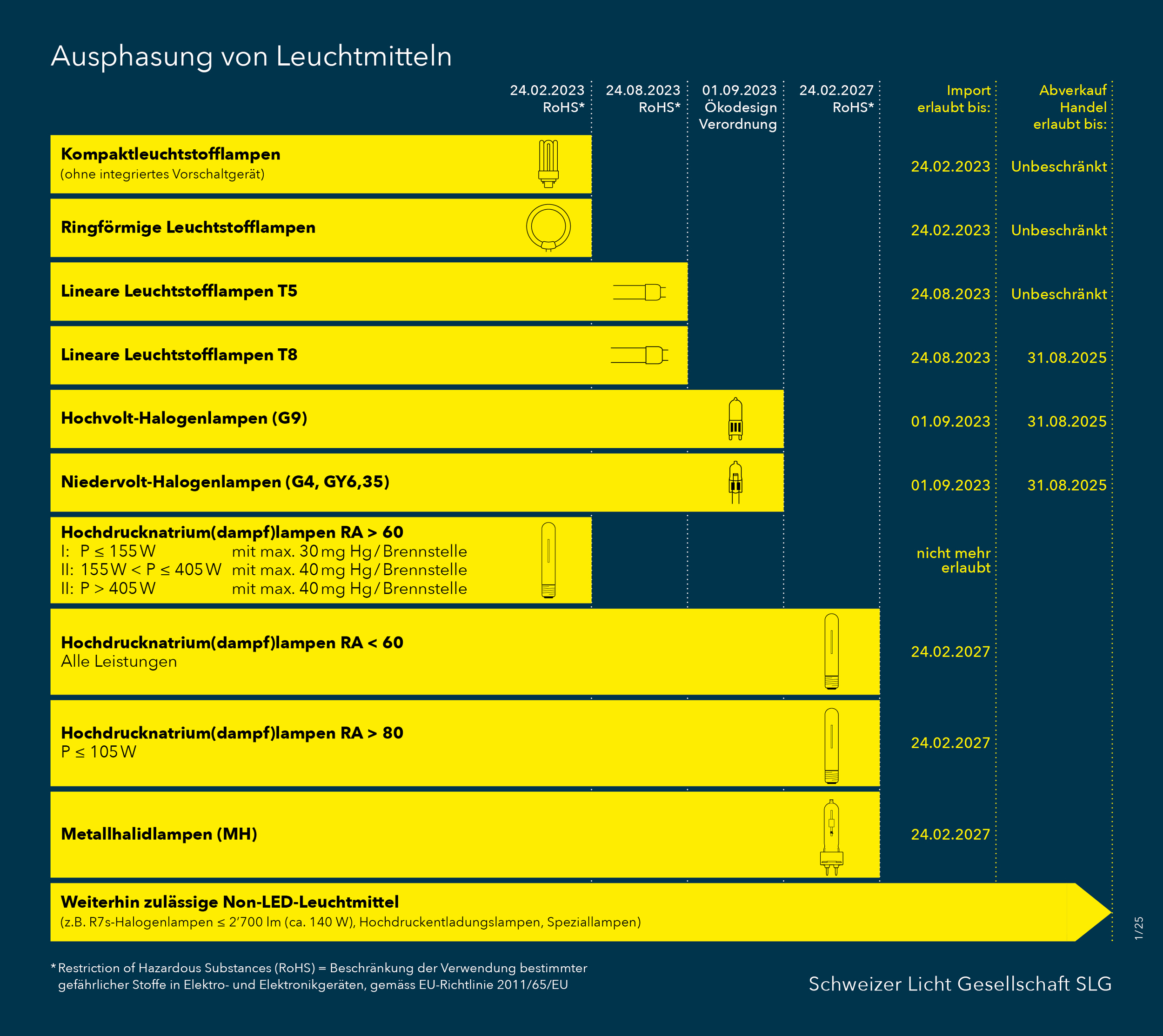 Die fehlende Energieeffizienz von alten Leuchtmitteln ist nicht das alleinige Argument für die Ausphasung. Die RoHS-Richtlinie (Restriction of Hazardous Substances in electrical and electronic Equipment) verbietet - bis auf wenige Ausnahmen - aus Gründen des Gesundheits- und Umweltschutzes die Verwendung von Quecksilber in den Leuchtmitteln.